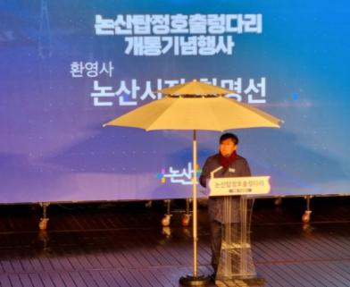 황명선 논산시장은 “민선 5기부터 탑정호 개발에 대한 원대한 꿈을 갖고, 적극적인 ‘세일즈 행정’을 펼친 결과 탑정호 주변에 많은 관광자원이 마련되며 논산발전에 큰 원동력이 되었다”며 “그 동안 탑정호 출렁다리에 뜨거운 애정과 적극적인 지지를 보내주신 시민 여러분들과 오늘의 뜻깊은 자리에 함께해주신 모든 분들께 감사드린다”고 말했다.