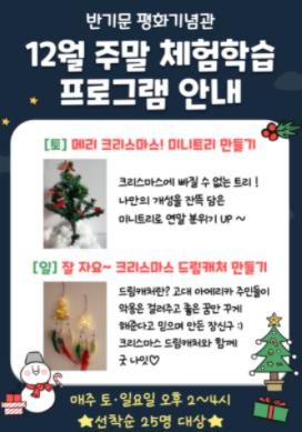채수찬 평생학습과장은 “2021년을 마무리하며 연말 분위기를 느끼실 수 있도록 크리스마스를 주제로 한 주말 프로그램을 기획했다”며, “많은 분이 반기문 평화기념관을 관람하고 주말 프로그램에도 참여해서 좋은 추억을 만들기 바란다”고 말했다.