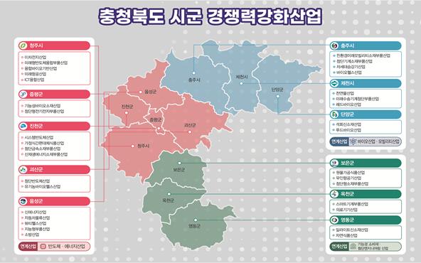 한편 충청북도는 금년 2월 11개 시군의 산업환경을 기반으로 경쟁력을 강화할 수 있는 산업을 선정하고, 시군 주도의 체계적인 추진을 위해 지역 산업거점 인프라 조성을 포함해 기업의 역량 강화, 네트워크 구축 등 산업육성 방안을 마련한 바 있다.