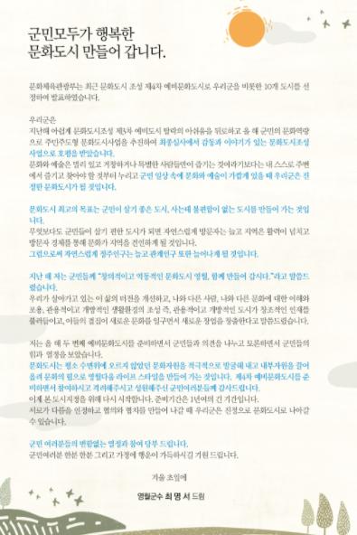지난 3월에 문화도시 플렛폼 구축을 위해 영월문화도시지원센터를 발족했고, 지속적인 시민 담론으로 민간주도의 문화 거버넌스를 위해 노력한 결과 시민들이 직접 만드는 모범적인 문화도시조성계획으로 호평을 받았다.