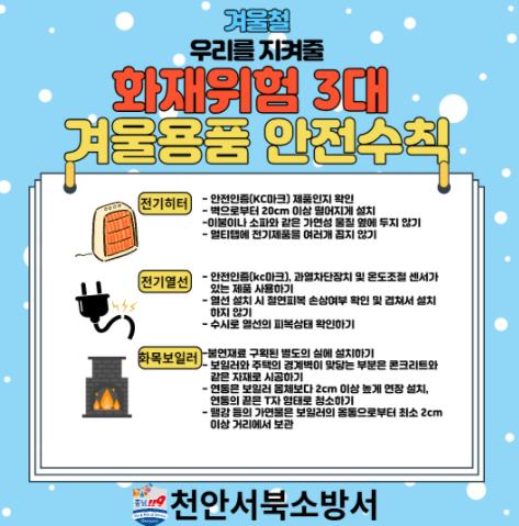 천안서북소방서는 화재 발생 위험이 증가하는 겨울철을 맞아 화재 등 각종 안전사고를 예방하기 위해 3대 겨울용품의 안전 사용을 당부한다고 밝혔다.