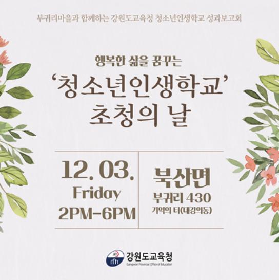 강원도교육청은 3일 오후 2시, 춘천시 북산면에 위치한 진로설계 전문교육 공간「청소년 인생학교」에서 2021년 운영성과 공유를 위한 ‘청소년인생학교 초청의 날’ 행사를 개최한다.