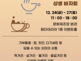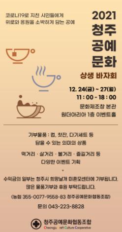 청주공예문화협동조합이 위드코로나 시대 단계적 일상회복을 돕고 시민에게 위로와 응원을 소박하게 담아 드리기 위해 12월 24일부터 27일까지 4일간 문화제조창 본관 1층에서 공예문화 상생 바자회를 개최한다.