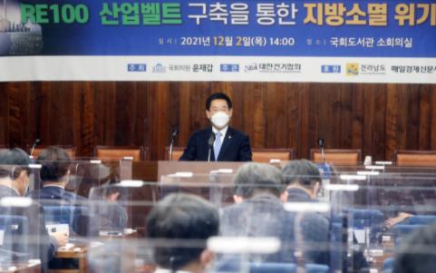 김영록 전라남도지사는 2일 국회에서 윤재갑 국회의원 주최로 열린 ‘RE100 산업벨트 구축을 통한 지방소멸 위기 대응 토론회’에서 “신재생에너지자급제가 지방소멸 해결의 대안이 되길 기대한다”고 밝혔다.