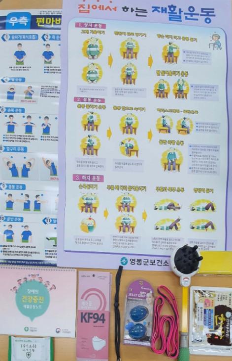 충북 영동군이 코로나19 장기화 속에서 가정에서 장시간 지내야 하는 보건소 미등록 뇌병변 및 지체 장애인 100명을 대상으로 “재활키트로 가정에서 운동하세요!”란 주제로 비대면 재활프로그램을 운영해 큰 호응을 얻고 있다.
