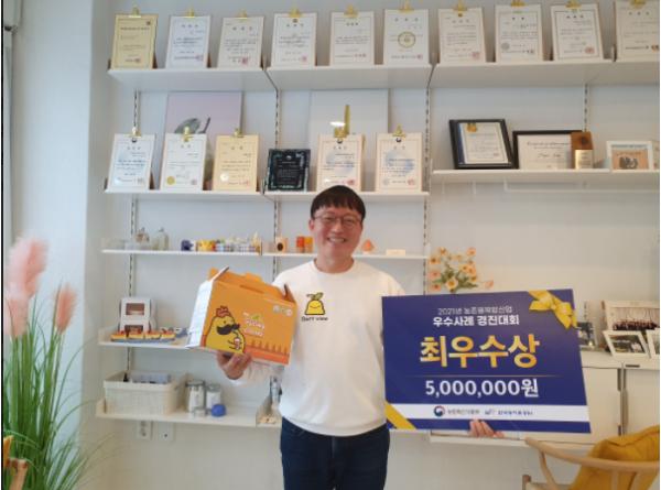 올해 최고 자리를 차지한 김영순 대표는 부모님이 운영하던 배 과수원을 이어받아 귀농한 청년 농업인이다. GAP인증 배?양배추?사과 등 농산물을 사용해 ‘꼬샤꼬샤도라지배즙’, ‘브롤로 양배추즙’ 등 HACCP 인증 과채주스를 생산하고, 체험형 카페도 운영하고 있다.