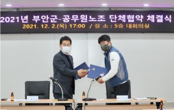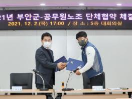 부안군은 지난 2일 권익현 부안군수와 고강형 전국공무원노동조합 부안군지부장 등 교섭위원 10명이 참석한 가운데 2021년 단체협약을 체결했다.