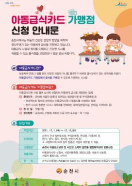 순천시는 결식우려가 예상되는 아동에게 다양한 급식을 제공하기 위해 내년부터 시행하는 아동급식카드 가맹점 모집을 오는 15일까지 모집한다.