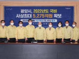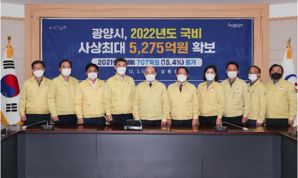 광양시가 12월 3일 국회 본회의를 통과한 2022년도 정부예산에서 5,275억 원의 국고 예산을 확보해 사상 최대의 국비 확보 성과를 이뤘다.