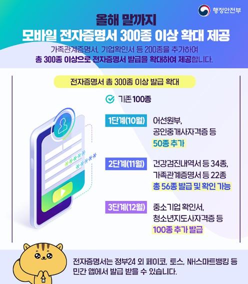 행정안전부가 2019년부터 디지털 정부 혁신사업의 하나로 추진 중인 시스템은 현재까지 주민등록 등·초본 등 100종의 민원서비스를 제공토록 구축됐으며, 2021년 말까지 가족관계증명서, 기업확인서 등 200종을 추가해 총 300종으로 확대 운영할 전망이다.