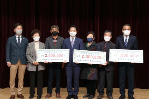 특히, 이번 장학금 기탁식에 참석한 (사)영암군새마을회와 도포면 남녀새마을지도자협의회에서는 재활용품 영농쓰레기를 수거·판매를 통해 얻은 수익금으로 각각 200만원씩을 장학금으로 쾌척하였고, 영암군청 총무과는 2021년도 대규모 통계조사 업무우수기관 표창에 따른 포상금 100만원을 지역인재 육성을 위해 장학금을 기탁하였다.
