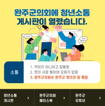 완주군 청년의 소리를 경청하고, 청년의 자유로운 생각을 전달받기 위한 공간으로 완주군의회 홈페이지에 게시판을 만들어 본격적인 운영에 들어갔다.
