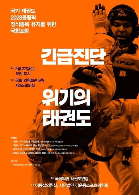 국회의원태권도연맹 총재 이동섭과 사단법인 김운용스포츠위원회는 오는 27일 오전 10시, 국회 의원회관 제2소회의실에서 ‘국기태권도 2028올림픽 정식종목 유지를 위한 포럼’을 개최한다.