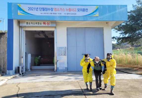 충주시가 3일 단월정수장 염소가스 저장소에서 상수도과 직원 20여 명이 참석한 가운데 ‘염소가스누출 대피 모의훈련’을 실시했다.
