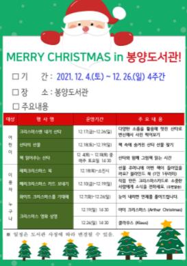“Marry Christmas in 봉양도서관”이라는 주제로 진행되는 이번 행사에는 산타, 크리스마스를 키워드로 한 교육, 체험행사 등 다양한 프로그램들이 마련되었다.