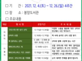 리모델링을 마치고 11월 20일에 재개관한 봉양도서관이 2021년 한 해를 마무리 하는 12월을 맞이하여, 지역 어린이와 주민들을 위해 다양한 문화행사를 준비했다.