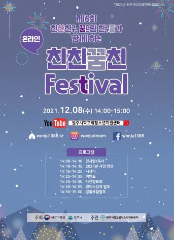 원주시 학교밖청소년지원센터는 학교 밖 청소년들의 축제인 제6회 친친꿈친 페스티벌을 오는 8일 오후 2시부터 유튜브를 통해 실시간 라이브 방송으로 개최한다.