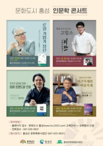 이번 인문학 콘서트는 코로나19 방역 지침에 따라 선착순 사전접수를 통해 참여할 수 있으며, 홍성군 문화특화사업단에 전화로 신청하거나 문화도시 홍성 홈페이지에서 신청하면 된다.