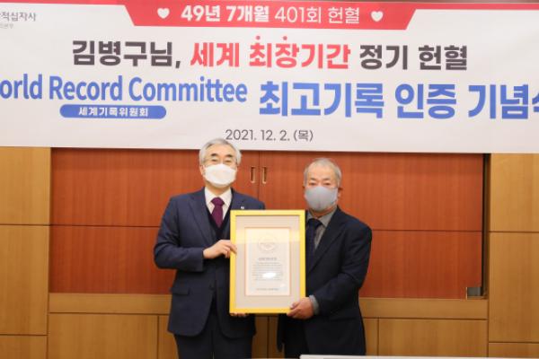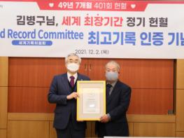 장성군민 김병구 씨가 월드레코드커미티(WRC, 세계기록위원회)로부터 ‘세계 최장기간 정기적 헌혈 기록’을 인증 받았다.