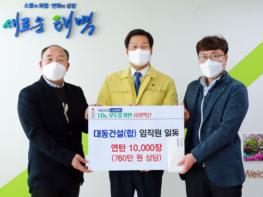(합)대동건설(대표 김대한)는 6일 태백시청을 방문하여 태백시 관내 생활이 어려운 저소득층 가구에 전해달라며, 연탄 10,000장(760만 원 상당)을 지정기탁 하였다.