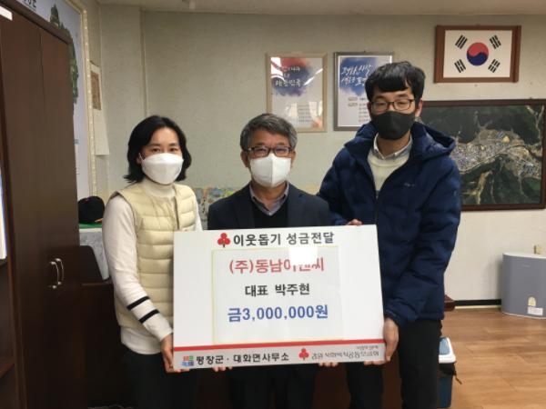 ㈜동남이엔씨 대표와 직원들은 지난 12월 초, 대화면사무소에서 이웃사랑을 실천하고 나눔 활동에 동참하기 위해 이웃사랑성금 300만원을 전달했다.