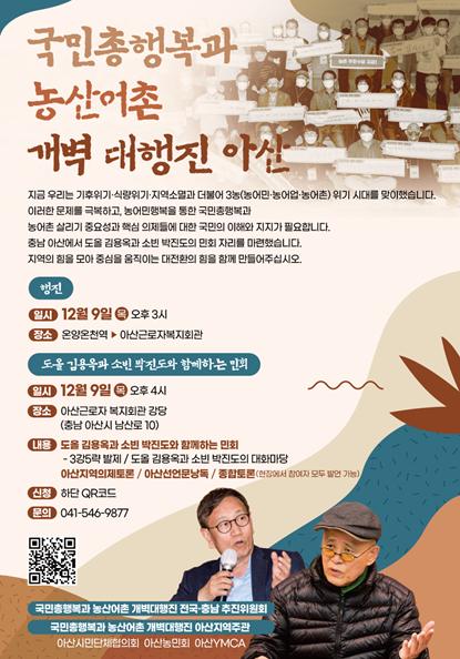 모든 국민의 행복 증진과 지속가능한 사회 발전, 3농(농어민·농어업·농어촌) 문제 해결을 위해 지난 10월 26일~27일 전남 해남군·곡성군을 시작으로 출발한 “국민총행복과 농산어촌 개벽 대행진”이 충남을 12월 9일 ~ 10일 찾아온다.
