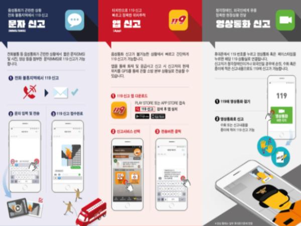 119 다매체 신고 서비스는 신고자와 119상황요원 간 영상통화는 물론 문자와 앱으로도 신고가 가능해 청각장애인 등 의사소통이 어렵거나 음성통화가 곤란한 경우에도 긴급 상황을 전달할 수 있다. 문자 신고는 119번호로 문자 입력 후 전송하면 신고가 접수되며 사진과 동영상도 첨부가 가능하다.