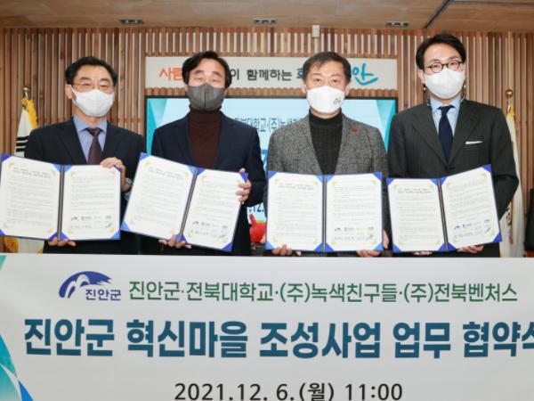 진안군은 지난 6일 전북대학교, ㈜녹색친구들, 전북벤처스(주)와 진안군 혁신마을 조성사업 추진을 위한 업무 협약식(MOU)을 가졌다.