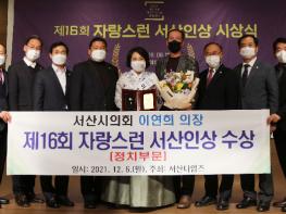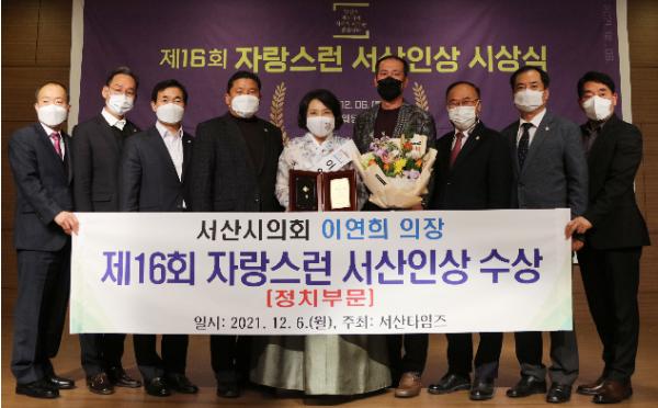서산시의회는 이연희 의장이 6일 아르델웨딩컨벤션에서 서산타임즈 주관으로 열린 ‘제16회 자랑스런 서산인상 시상식’에서 ‘자랑스런 서산인상’을 수상했다고 밝혔다.
