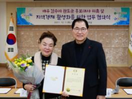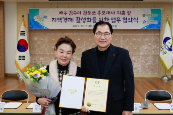 완도군은 12월 7일 국민 배우 ‘일용 엄니’ 김수미 씨를 완도군 홍보대사로 위촉하고 소속사인 나팔꽃 그룹(대표 정명호)과는 특산물 소비로 지역 경제 활성화를 위한 업무 협약을 체결했다.