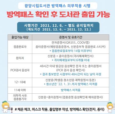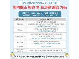 방역패스 의무 적용 확대는 오미크론 등 코로나19 확진자의 증가세를 멈추기 위한 특단의 조치로 12월 6일부터 시행 중이며, 도서관을 비롯한 신규로 지정된 시설은 1주간의 계도기간(6~12일)을 거쳐 13일부터 본격 시행된다.