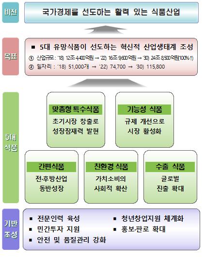 정부는 인구 구조, 소비 및 유통 트렌드 분석을 토대로 앞으로 성장가능성이 크고 사회·경제적으로 중요한 5대 유망분야로 메디푸드, 고령친화식품, 대체식품, 펫푸드 등 맞춤형·특수 식품, 기능성 식품, 간편식품, 친환경 식품, 수출 식품을 선정하고 제도 정비 및 규제 개선, 연구개발 지원 등을 포함한 분야별 대책과 함께, 전문인력 양성, 민간 투자 확대 등 산업 육성을 위한 인프라 구축 방안을 제시했다.