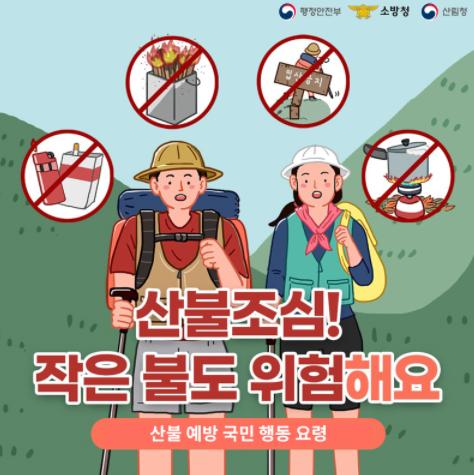 부주의로 인한 산불을 예방하기 위해선 ▲산림 인접지역 쓰레기 소각 금지 ▲등산 시 라이터, 버너 등 화기물 소지 금지 ▲허용된 지역 외 취사 및 불피움 금지 ▲흡연 또는 담배꽁초 투기 금지 등이다.