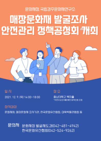 문화재청은 오는 9일 오후 2시, 충남대 백마홀에서 매장문화재 발굴조사 안전관리와 관련한 정책공청회를 개최한다.