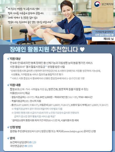 - 활동지원급여(1~15구간) : 최소 84만 2,000원 ~ 최대 673만 원(’21년 기준), 약 60~480시간