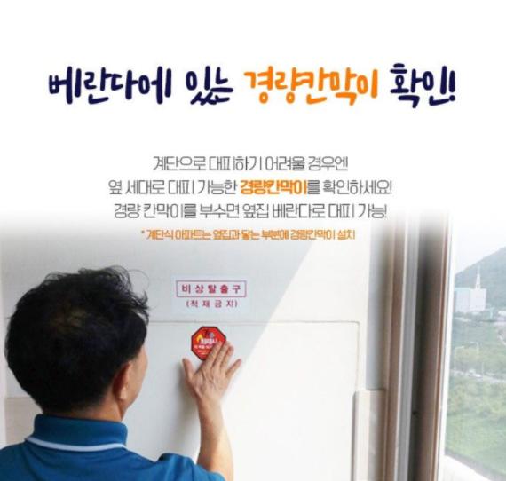 경량칸막이는 공동주택 화재 발생 시 출입구나 계단으로 대피하기 어려운 상황을 대비해 베란다 벽면에 만들어 놓은 얇은 석고 보드 벽으로, 비상 상황일 경우 충격을 가하여 부순 뒤 바로 옆 세대로 피신하도록 만든 통로이다.