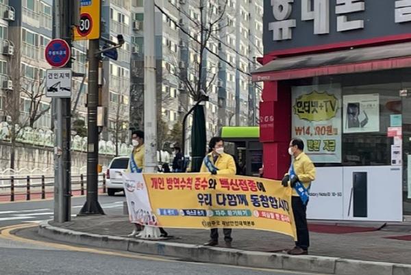김성명 부군수와 재난안전과·행정지원과·봉동읍 직원들은 9일 오전 8시부터 30분 동안 완주군 봉동읍 둔산리의 한 사거리에서 현수막을 이용한 방역수칙 준수 홍보 캠페인에 나섰다.