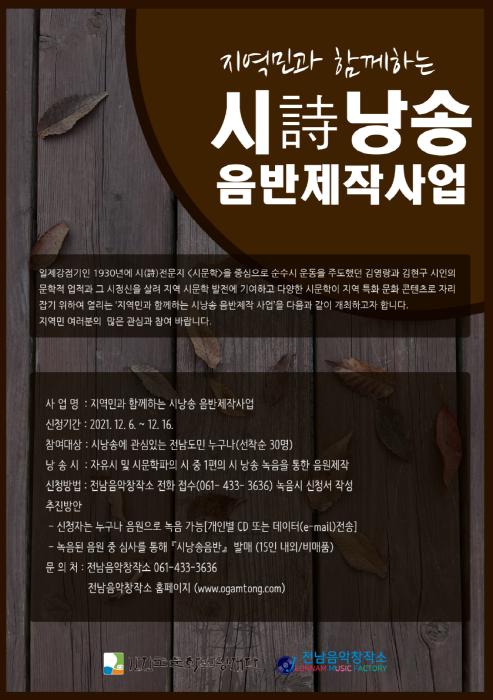 지역민과 함께하는 시낭송 음반제작 사업에 대한 자세한 사항은 전남음악창작소로 문의하면 된다.