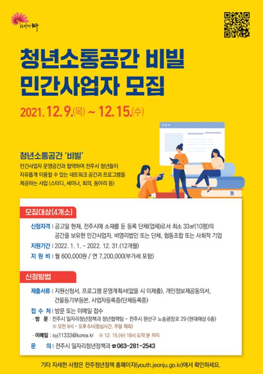 전주시는 오는 15일까지 내년도 청년소통공간 ‘비빌’을 운영할 사업자 4개소를 공개모집한다.