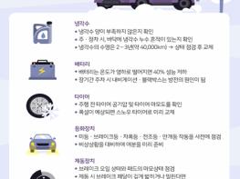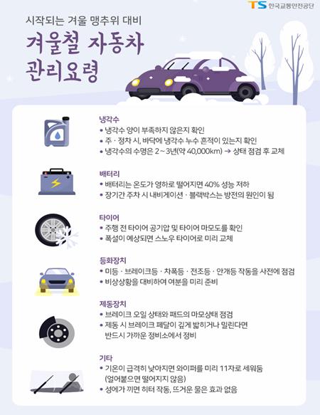 도로 결빙에 대비하여 스노체인, 염화칼슘, 삽 등 월동용품을 미리 구비하고 부동액, 축전지, 윤활유 등 자동차 상태를 사전에 점검한다.