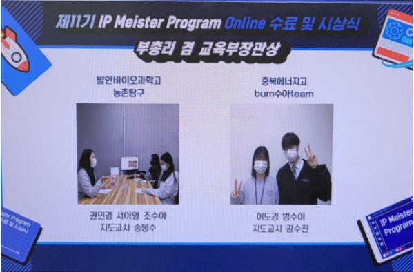 제11회 IP마이스터 프로그램에 전국에서 12,00여팀이 지원하였으며 본교에서는 2팀의 아이디어가 최종 선발되었다. ‘비상용 망치 안전벨트(3학년 이도경, 2학년 범수아, 지도교사 강수진)’ 제품은 차량 침수나 전복 사고가 발생했을 때 안전벨트에 유리를 깰 수 있는 비상용 망치가 부착되어 있는 제품으로 아이디어 가치를 높게 평가받아 부총리겸교육부장관상을 수상하였다.