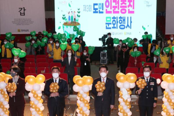 각계각층의 도민 30여 명이 참여한 세계인권선언문 낭독 영상 상영, 인권 증진 활동 유공자 표창 및 인권작품 공모전 입상자 상장 수여, ‘누구나 안전하고 행복한 인권의 땅 전남’을 만들자는 의지를 표현한 인권증진 퍼포먼스 순으로 진행했다.