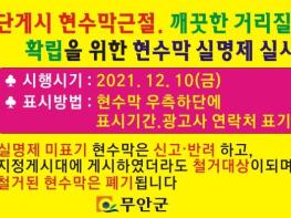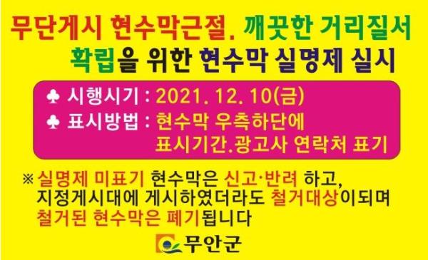 무안군은 주요 도로변과 인도에 설치된 불법현수막 근절을 위해 10일부터 현수막 실명제를 시행한다고 밝혔다.