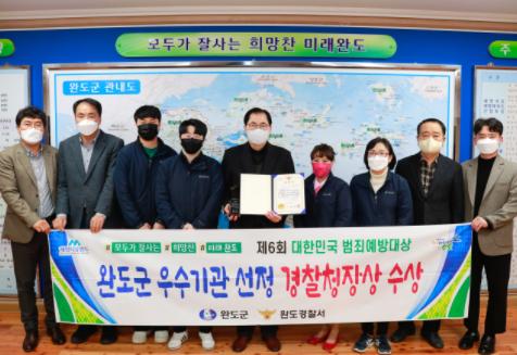 완도군이 경찰청과 중앙일보가 주최하는 '제6회 대한민국 범죄예방대상'에서 우수기관으로 선정되어 지난 3일 중앙일보사에서 개최된 시상식에서 김창룡 경찰청장으로부터 경찰청장상을 수상했다.
