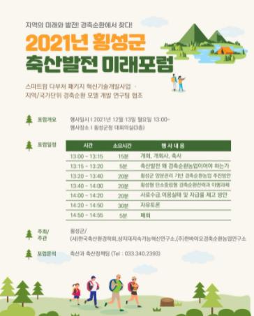 횡성군은 ‘지역의 미래발전 경축순환에서 찾다’를 주제로 2021년 축산발전 미래포럼을 13일 오후 1시, 군청 대회의실에서 개최한다고 밝혔다.