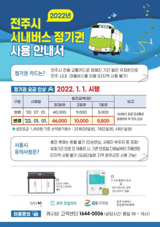 시는 정기권 요금 인상으로 인한 시민 불편이 발생하지 않도록 요금 변경내용을 버스 승강장 BIS, 전주시 홈페이지, GS25 편의점 등을 통해 지속적으로 홍보할 방침이다.