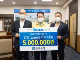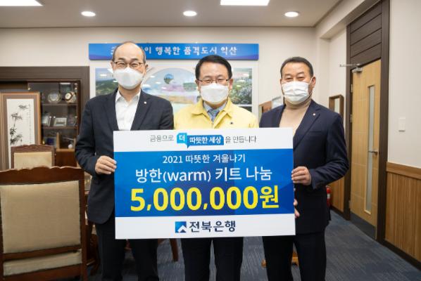 전북은행은 10일 익산시청을 방문해 500만원 상당의 한겨울대비 방한 키트 100상자를 전달했다.