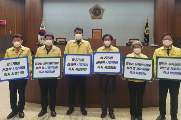 농해위 소속 김영권·김기서·김득응·정광섭·김명숙·윤철상·장승재 의원 일동은 10일 성명서를 통해 공급과잉으로 인한 쌀 농가의 어려움을 호소하고, 공급과잉 예상 물량에 대한 시장격리 조치를 즉각 시행하라고 촉구했다.