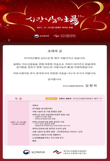 보건복지부는 독거노인종합지원센터와 함께 어르신들께 따뜻한 사랑을 나누고 있는 분들을 격려하기 위해「2021년 사랑 나눔의 장(場)」행사를 개최하였다고 밝혔다.