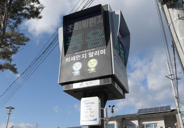 양구군은 공공장소에서 주민들에게 양구의 기상정보를 제공하기 위해 최근 양구읍 박수근광장에 미세먼지 신호등을 설치해 운영하고 있다.